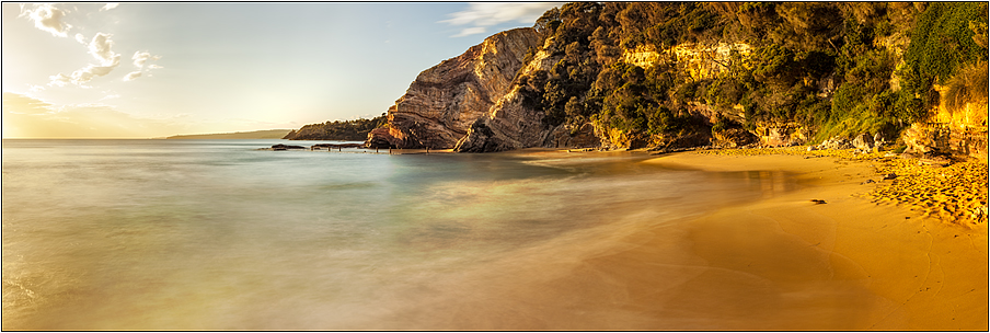 The golden dawn light of another perfect summer day pours in over the Tasman sea. Eden's glorious Aslings beach and rock pool cliffs looked stunning this particular morning. |