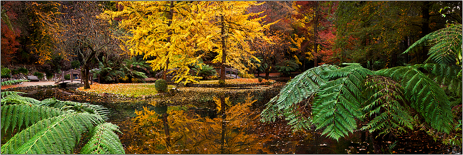 A perfectly still afternoon in late autumn and the scenery in the Dandenong ranges is as pretty as a picture could be. I really like how the native tree ferns frame the deciduous european gardens. |