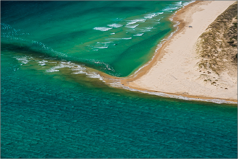 At the northern most tip of Fraser island currents meet and waver a never ending battle with vast quantities of sand representing the front line. Strong north winds whip the shallows in the lower half of the frame creating incredible patterns of turbulence in the sand making for a rare and spectacular scene. |