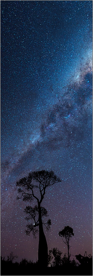 On a clear dry night in the outback a classic Queensland bottle tree (Brachychiton ruspestris) stands starkly against the Milky way galaxy. |