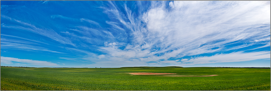 An idyllically warm spring day sees magical light and skies above this Mallee wheat crop in the late afternoon light. A clay pan can be seen in the middle of the field whilst a bank of imp[ressive cirrus clouds move in from the NW ahead of the next weather system. |
