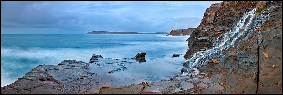 A wet start to winter with 200-300mm of rain falling in about 6weeks. So after a night of heavy rain I took the opportunity to shoot this location, it's a small creek and catchment that rarely gets much flow. As the rising sun illuminated a cloud beyond my left shoulder a very soft glow of dawn light bounced on to the cliffs and Cape Woolamai in the distance. |