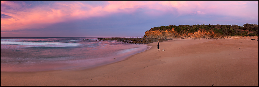 A surfer stretches whilst taking in the spectacular dawn sky before he paddles out for his morning quota of waves. |