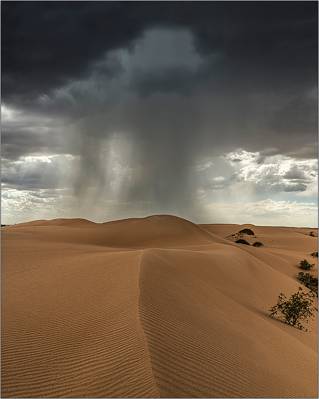 In late February 2014, a low pressure 'trough' stretching from the north into inland eastern Australia provided instability in the atmosphere, and temperatures in western New South Wales approached 40°C. I had travelled from Victoria's Sth Gippsland specifically for these conditions in the hope that I would encounter some unique photographic opportunities in the region. In the dunes area of Mungo NP I spotted the convection that I was looking for. I was determined to catch it and knew exactly where and how I wanted to photograph it. I hurriedly made my way through around 30 km of 4WD tracks. Then with all my gear on my back and bare feet I ran almost a km scaling over multiple dunes in the 40°C heat to a ridgelinethat I had found the day before that I thought would align for my dream composition. I arrived just in time to shoot only a few images as the storm grew, it burst out lightning and thunder around me. In no time the heavy rain and outflow winds of an estimated 70km/h also hit. With absolutely no cover to be found in a sand dune field, I croucheddown in a ball making myself small and not a target for lightning whilst protecting my gear as Irode out the brief but spectacular storm. I got caked in wet sand blown clay dust as the temperature temporarily dropped. Although covered in sweat, rain and mud I couldn't wipe the smile off my face as I walked back to my vehicle. This is what I had planned, hoped and come for.