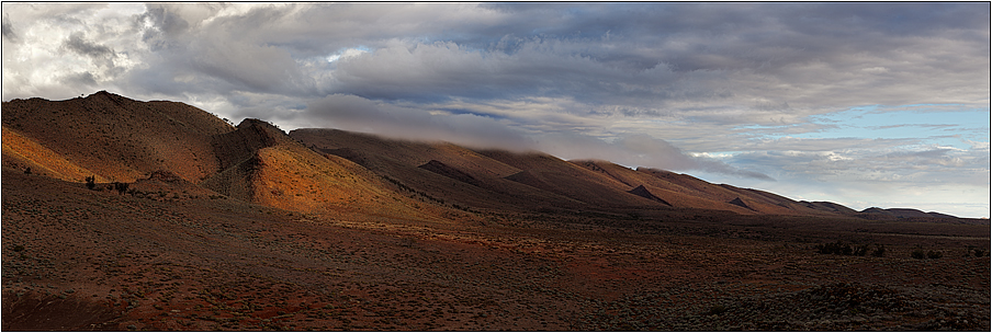 A uniquely shaped range in the northern Flinders Ranges is dappled in light and cloaked in mist.