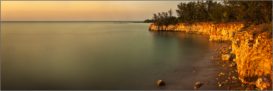 It was a stiffling hot and humid afteroom in the nation's northern most city of Darwin. The 'build up season' was at it's height before it cracks into the wet season when welcome relief and rain comes to all. I felt that these burning ochre hues of the cliffs and late twilight sky reflecting over the water summed up the oppressiveness of the day perfectly. |