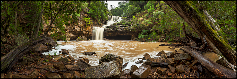 I got to this location the day before in anticipation of photographing an image such as this. This is a very short catchment and for it to flow with any note it requires a significant rain event. There was one on the cards and I had eagerly been watching it come to furition fpor more than a week beforehand. So upon my arrival the day before about 70mm of rain had fallen and it wasn't much more than a trickle, but I knew a lot more was on the way as a low pressure system tightened and nudged eastwards into a more favourable position. It poured all night and in the following morning after well over 100mm of rain a flash flood makes it's way down stream and plummeting over huge rock ledges and overhangs. A sight and sound to behold. |
