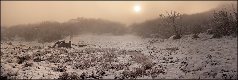 The sun struggles to break through the heavy mountain mists.Yet even in these conditions with the temperatures well and truly below zero degrees there is a unique beauty to be experienced. |