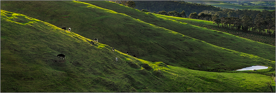 The Strzelecki Ranges drop dramatically into this fertile a gully and I couldn't believe my luck when I rounded the corner on this icy winter morning and saw the early light hitting the ridges of these 'green fingers' of hills. Not only was the light hitting the ridges, but also a small herd of cattle grazing completed a magical scene. |