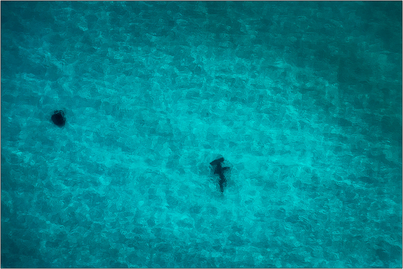 Two giants of their species loom eeriely close togather in the luminescent shallows of Fraser Island. A giant turtle to the left of frame and an extremely large hammerhead shark in the centre - what an incredible sight! |