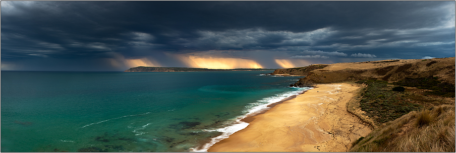 An afternoon thunderstorm makes it's way out to sea over Phillip Island. The late afternoon sunlight helped to produce some incredibly luminous conditions beneath forboding skies. Lightning speared from the heavens as the quickly moving storms rapidly approached me. I kept shooting and got my images that I desired before fleeing to safety in a nick of time. |