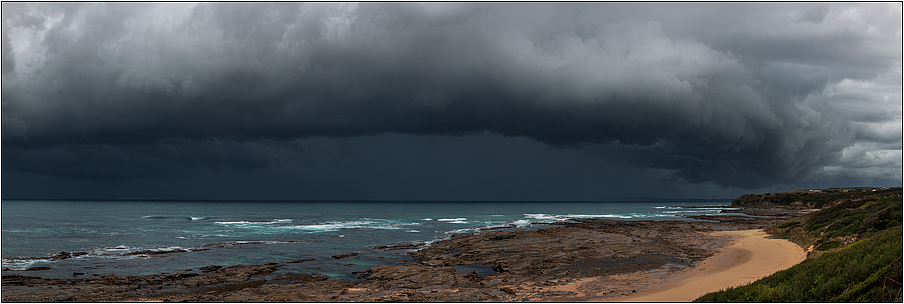 An approaching squall line bares down on the spectacular Bass Coast. In this image you can just make out Phillip Island's Cape Woolamai which is becoming engulfed by the intense rain core. |