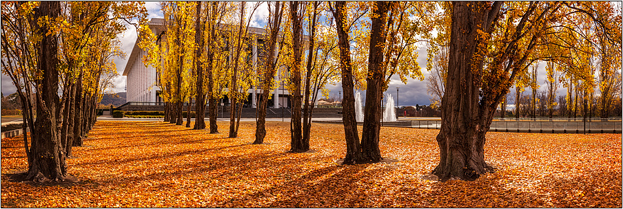 The sun peaks through the morning cloud cover on a chilly autumn morning in the nation's capital of Canberra.I was drawn by the vertical lines of not only the trees, but also the architecture of the National Library building itself. These are juxtaposed by the shadows across the carpet of autumn leaves. |