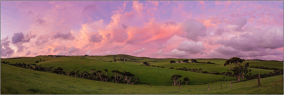 A rainband had cleared right on sunset and I had a suspicion that if the low cloud to the west would break then the sky could be a brilliant display to the east. Fortunately it came off and I composed this image of beautiful light and the lush pastures of the South Gippsland hills. |