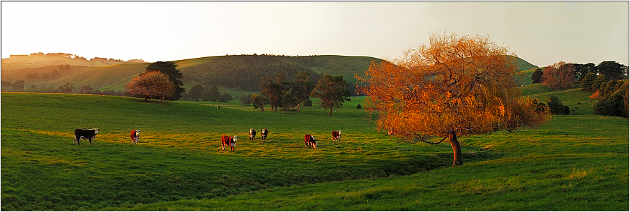 The last of the autumn colour is illuminated by the setting sun in this rural setting. I'd spent considerable time during autumn looking for potential autuminal rural scenes in the South Gippsland hills. When I saw this particular composition on an overcast afternoon I just knew I had to return before winter. Three days later conditions looked promising so I returned. I couldn't believe my luck that there was some cattle grazing in the paddock and that they were hereford's with several perfectly poised in the sun's spotlight. |