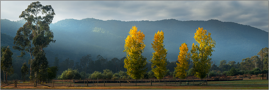 The morning sun shines through the valley mists and sensually caresses the autumn leaves of these four poplar trees. |