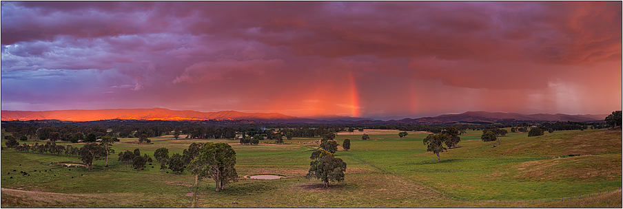An approaching thundertorm drifts off Mt Buffalo (faintly visible through the rain in the distant right of frame). I had been playing about with these thunderstorms through the region all afternoon without really getting an image that was nmenmorable. So when the light broke through the cloud from over my right shoulder I was blown away by this spectacular display. |