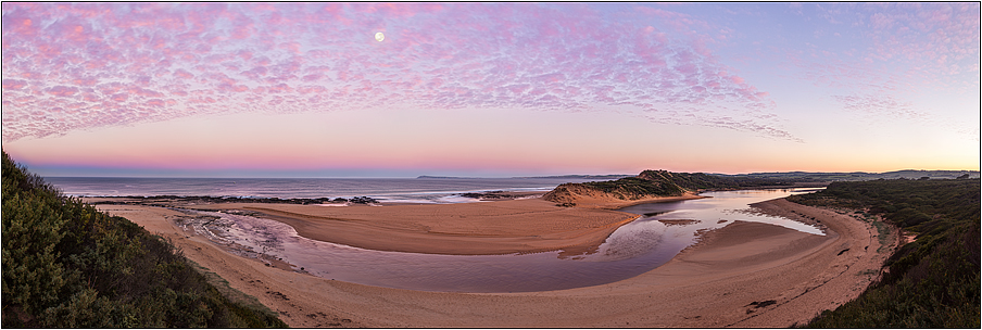 The 'super moon' (which is the largest the moon appears for the year as it's closest proximity to earth) sinks in the western sky amidst a spectacular array of mid level cumulus tufts. One positive about shooting dawn images in mid winter is that you don't have to get up as early as in summer, but this generally comes with a temperature and discomfort 'cost'. Needless to say it is always worth it and a great start to the day when you get to experience moments in time such as this. |