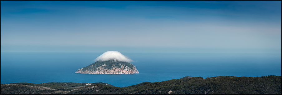 After receiving a photo album of my late Great aunts some 13 yrs ago which had images from her worldwide travels in particular I was mesmerized by her photographs from Lord Howe Island which had spectacular lenticular clouds capping the rugged and remote peaks. My imagination was swept away and I had long developed a desire to photograph a similar scenario. So having once seen the same phenomenon at couple of spots around South Gippsland and knowing the mechanisms required to be in place I was jubilant when it all fell into place offshore as Rodondo Island rises starkly out of the clear blue water that surround Wilsons Prom. The strong moist easterly winds plough into the rugged granite peak, forced to rise and condense, thus forming a visible cloud, like a veil of mystique shrouds the peak of the island before thinning and dissipating on the leeward side - in this case the right of frame. |