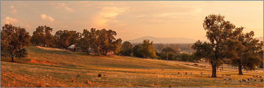 About half an hour out of Albury in southern NSW a flock of sheep grazes in the gorgeous late afternoon light. A lot of post summerprescribed burn offs made the air very smokey and the light infused, which adds to the image. A closer inspection of the large resolution file also reveals some cute little lambs as well. |