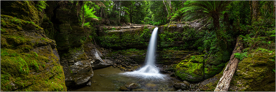Even in the midst of summer, cool fresh water still shoots off this gorgeous rock platform in the cool temperate rainforests at the foot of Tasmania's Great Western Teirs. |