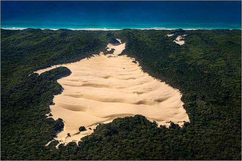 A massive sand dune marches across Fraser island. Like an unstoppable force, engulfing all in it's path. It reminded me of the cult sci fi movie 'the thing' as it's tendrils sread further into the forest. |