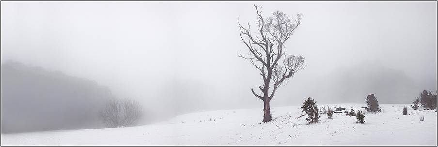 This lone eucalypt stands starkly in the snow and mist near the summit of Victoria's Mt Donna Buang. Part of the Yarra Ranges NP, Mt Donna Buang is only about 80km's from Melbourne but is relatively low in elevation at just 1250m ASL, so decent snowfalls are a bit rare and don't last 'that' long. |