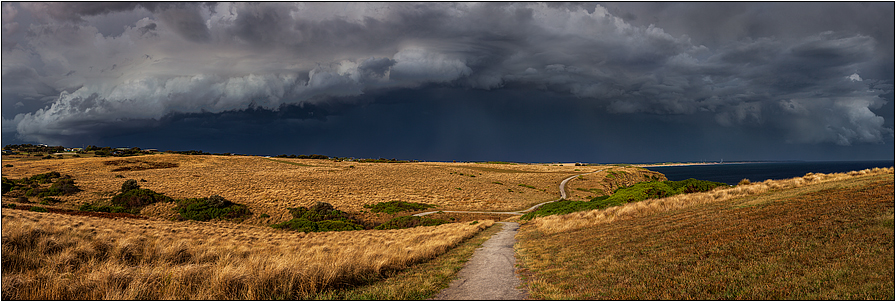 A severe thundstorm tracks across the coast as the sun sun now illuminates the splendid native coastal grasses along the coastal walking trail. Thankfully I wasn't caught out walking when this one hit, with no shelter the 1cm hail and 80+km/h winds wouldn't have been much fun. |