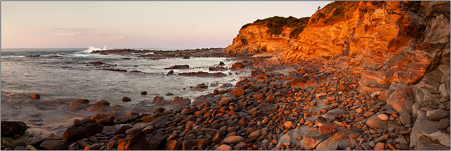 This particular spot is the only location on the entire Bass coast where the sedimentary sandstone has a subtle colour shift from the usual grey/ochre tones. The stone here has a soft mauve hue to it making it even more conducive to lighting up under the twilight sun. On this particular occasion the warm golden light of a summer dawn vividly paints the coastal cliffs and I was fortunate enough to be there to capture the moment. |