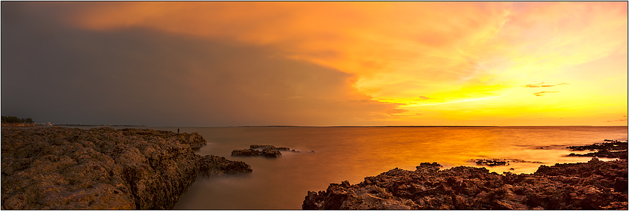 It was a stiffling hot and humid afteroom in the nation's northern most city of Darwin. The 'build up season' was at it's height before it cracks into the wet season when welcome rain brings relief to all. Whilst I felt that these burning ochre hues of the rock platforms and late twilight sky reflecting over the water with the relaxeding vibe of an angler dangling a line summed up the the life of Darwin at this time of year perfectly. |