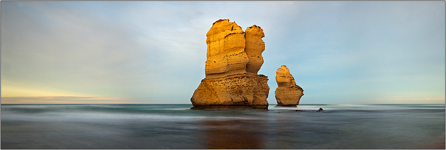 A couple of rock stacks make their last stand against the relentless energy of Bass Strait. |