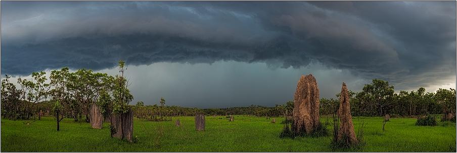 One of the Top-end's infamous build up thunderstorms surges across this spectacular field of termite mounds. Unlike the renouned termite mound field at Litchfield NP that is solely comprised of flat shaped magnetic mounds, this one has a unique blend of 2 types dominating the landscape. |