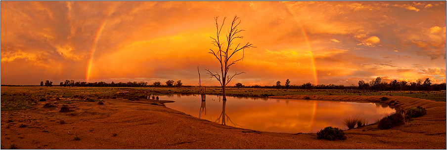 I was storm chasing in the central west rural district of NSW. Unfortunately the approaching squall line had weaked and become a thundery rain event and not worthy of photographing. Determined to make something from my day I saw a weakening gap develop in the line to the south, so I took a gamble and shot off at a rate of knots thinking that I may get a stunning sunset for all my efforts of the day. What eventuated would easily be the most stunning rainbow I have ever photographed. The next challenge was finding somewhere to photograph it. I spotted this dead tree and dam, I hit the brakes, grabbed my gear and took off jumping the barb wire fence. Luckily bare feet proved the footwear of choice as the mud was ankle deep and extremely sticky! All worth it in the end and after the show was over and I cleaned up. I then eased off content as a man could be with how it all panned out. |