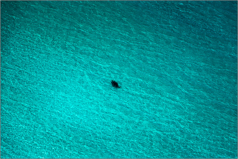 A giant turtle slowly makes it's way through the luminous shallows of Platypus bay.