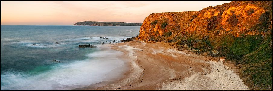 Very early on a spring morning the rising sun illuminates the cliffs and Cape Woolamai in the distance. I like the patterns on the beach with all the white areas being shells. |