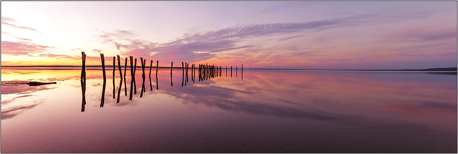 A series of old jetty pylons reflects perfectly in westernport bay, the setting sun has spectacularly painted the early evening sky. |