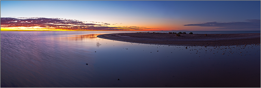 The sun had set and my trek for over a kilometer through deep mud and water to this tiny island on Lake Eyre was well rewarded. The 'tidal' lines that abound the island's shoreline were amazing in their detail and formation. The nuances of the desert wind's interaction with this tiny island were also amazing. I was attracted to this composition by the skeleton of the dead shrub washed up in the shallows to provide further interest in the image. |